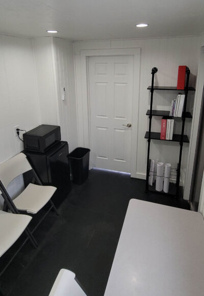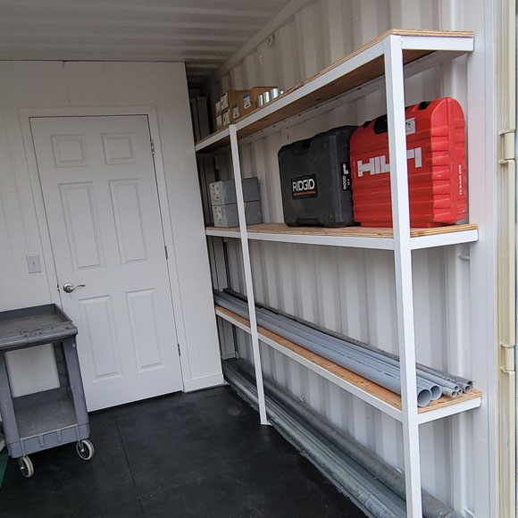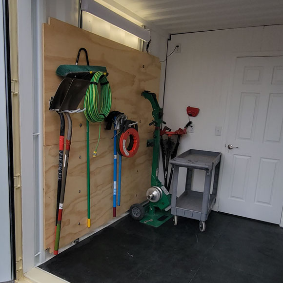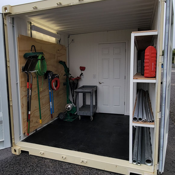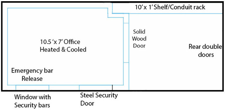 - 9′ X 8′ garage, used for storing and securing Tools, Material, and Supplies.