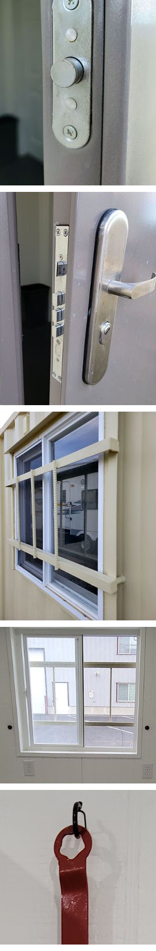 STEEL SHIPPING CONTAINER SHELLBUILT OUT OF ONE TRIP OR NEW SHIPPING CONTAINERS WATERTIGHT, HARD STEEL SIDES, STRONG CONSTRUCTIONDESIGN APPROACH MINIMIZES THE IMPACT TO THE FACTORY PAINT FINISH STEEL DOOR WITH “SAFE DOOR” STYLE SIDE BOLTSTHE DOOR HAS TWO DEAD BOLT SYSTEM. THE MAIN IS A KEY ACTUATED WITH (5) BOLTS ALONG THE LEADING EDGE. THE SECOND IS A KNOB FOR A SINGLE PRIVACY KNOB. STEEL BARS OVER WINDOWSTEEL REBARS SOLIDLY WELDED TO CROSS BRACES THAT CAN BE HINGED BY REMOVING SECURITY BOLT ON THE INSIDE (security wrench included). THIS FACILTATES A WINDOW EXIT IF NEEDED. DOOR LOCK BOX ON REAR DOORA SECURE LOCK BOX COVER FOR A STANDARD LONG SHACKLE LOCK SAFE PLACE FOR TOOLS AND MATERIALSOLID WOOD DOOR BETWEEN THE OFFICE AREA AND THE TOOL/MATERIAL AREA |